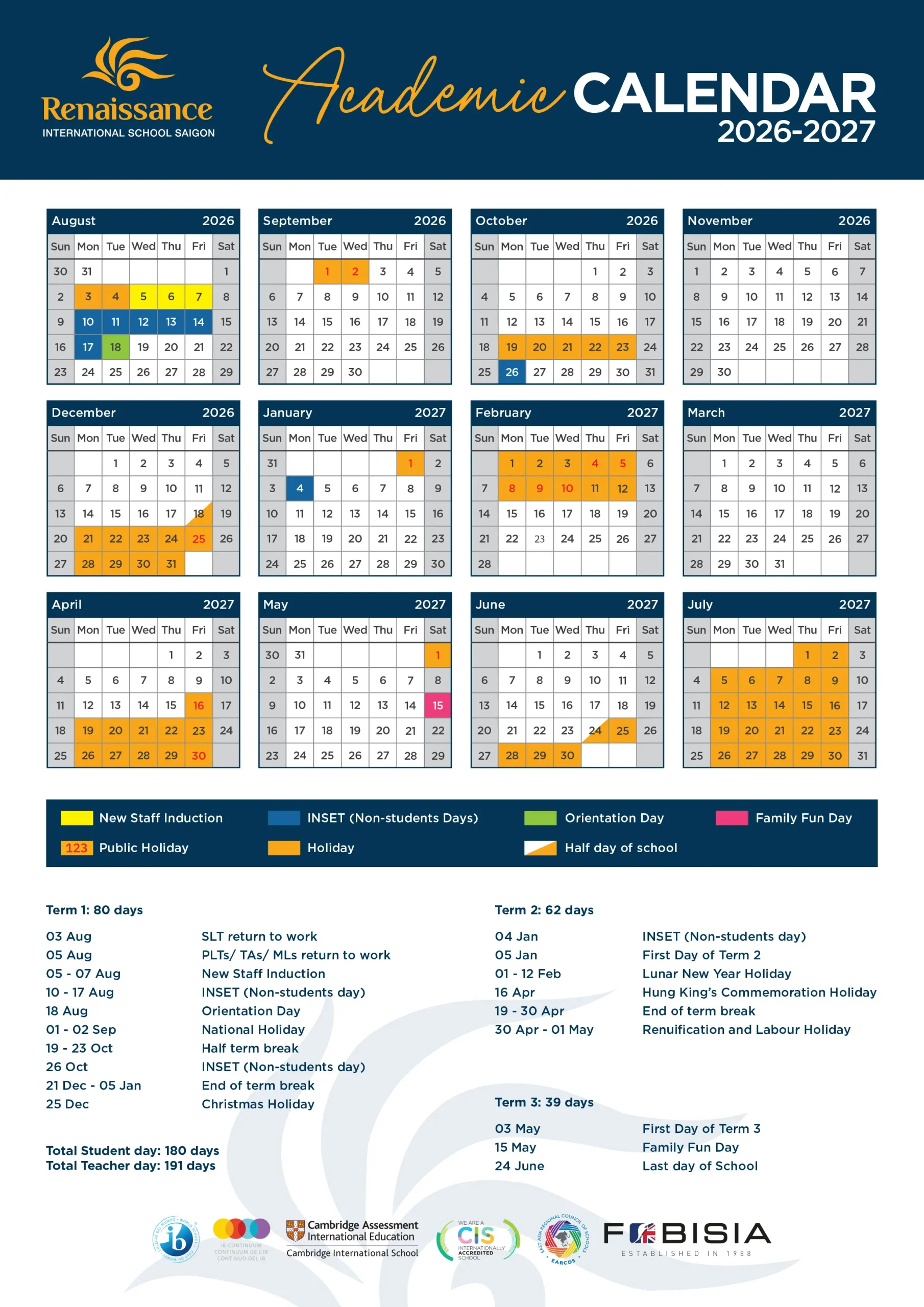 Tại Trường Quốc tế Renaissance, nhà trường hiểu rõ tầm quan trọng của một lịch trình học tập được tổ chức khoa học trong việc tạo dựng môi trường giáo dục đầy hỗ trợ và hiệu quả. Lịch năm học sẽ là nguồn thông tin hữu ích để cộng đồng chúng ta luôn nắm bắt những mốc thời gian quan trọng và sự kiện diễn ra quanh năm.